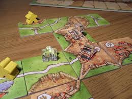 Carcassone is a classic tile laying game. It's kind of like Dominoes but fun. You get points based on how you place your meeples and the tiles each turn, creating cities and fields and roads and farms. It's really simple and is really fun. We have the Big Box so we have a boatload of expansions and can play up to six (I think, maybe seven).